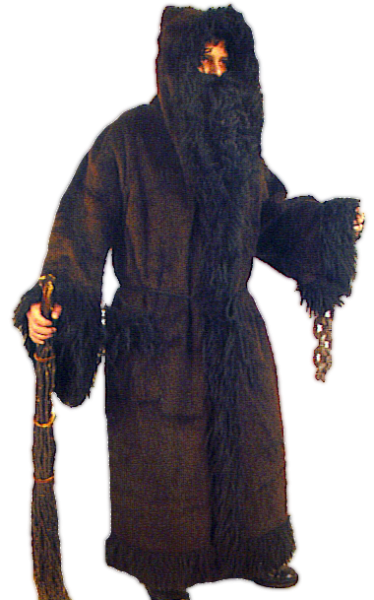 Il est souvent équipé d'un fouet, d'un martinet ou de branchages. Il menace les enfants désobéissants ou ceux qui rechignent à réciter leurs prières de les emporter avec lui dans une hotte ou un grand sac de jute.